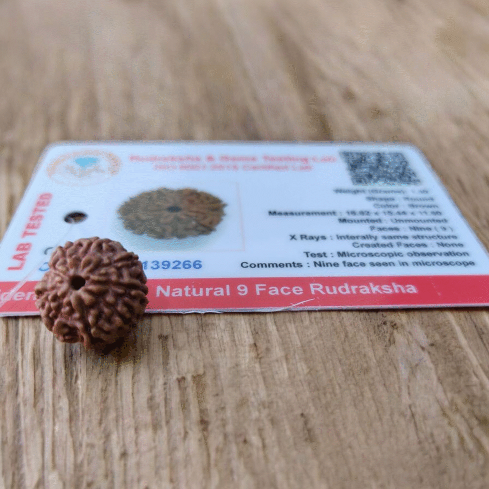 Always ensure the Rudraksha you purchase is genuine, lab-certified, and sourced ethically. A real 9 Mukhi bead has nine natural lines or clefts running from top to bottom and feels warm to the touch when held in the palm.
