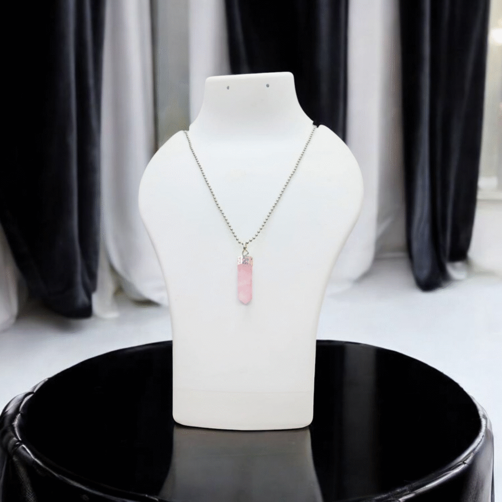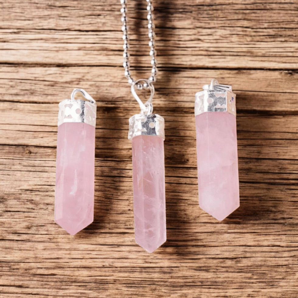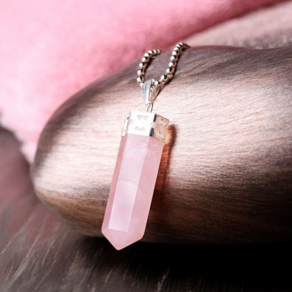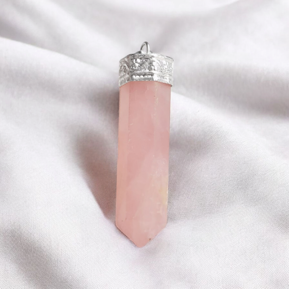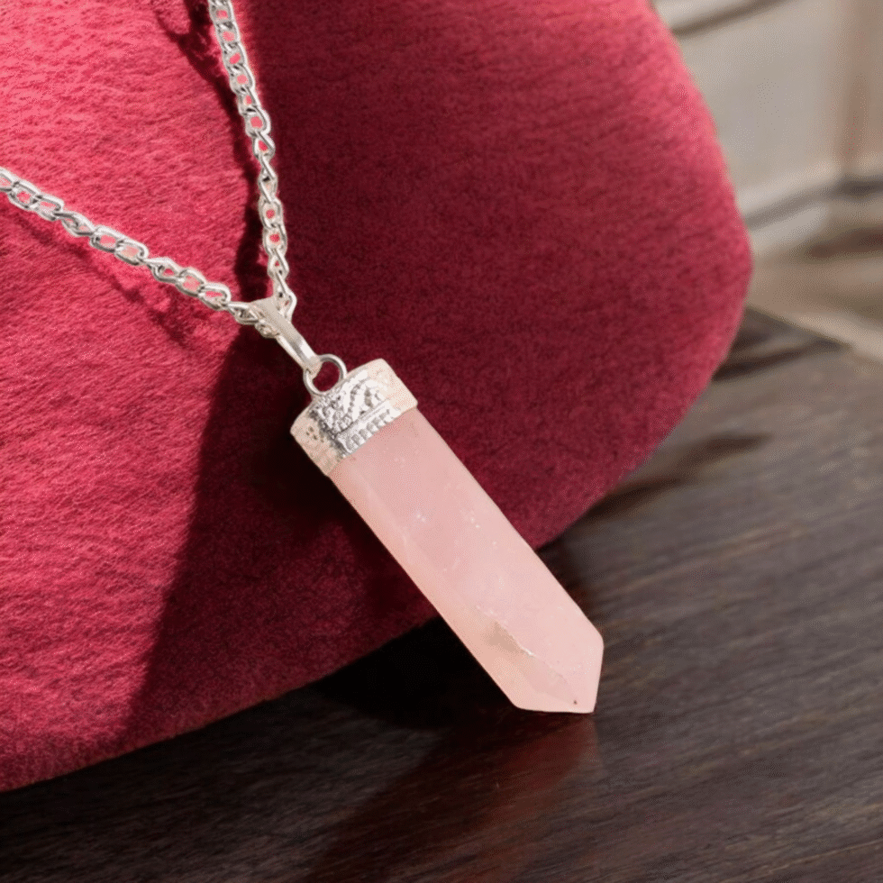 A soft pink Rose Quartz Pencil Pendant that radiates unconditional love, emotional healing, and self-compassion. Ideal for attracting love, strengthening relationships, and soothing the heart chakra.